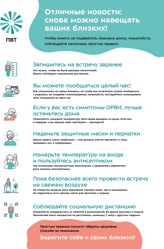Мы прекращаем вахтовый режим работы и объявляем о возобновлении посещений с 3 августа 2020 года. Нам всем нелегко далось время вынужденной разлуки. Сегодня ситуация стабилизирована. Однако мы вынуждены следовать некоторым ограничениям. Поэтому вводим временные правила посещения, прочитайте их внимательно. Пожалуйста, предупредите нас о своем визите, позвоните по телефону и сообщите дату и время визита.