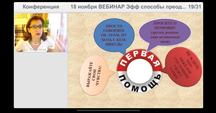 Продолжаем серию вебинаров с коллегами из Московской службы психологической помощи населению. Сегодня вместе со Светланой Анатольевной Исаевой разбирали тему эффективных способов преодоления тревоги и стресса, связанных с происходящим событиями (Сovid-19).
