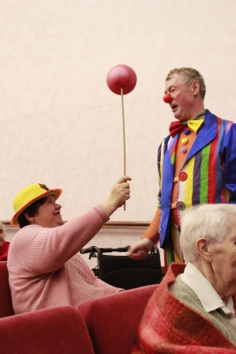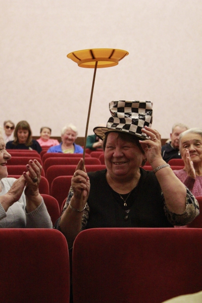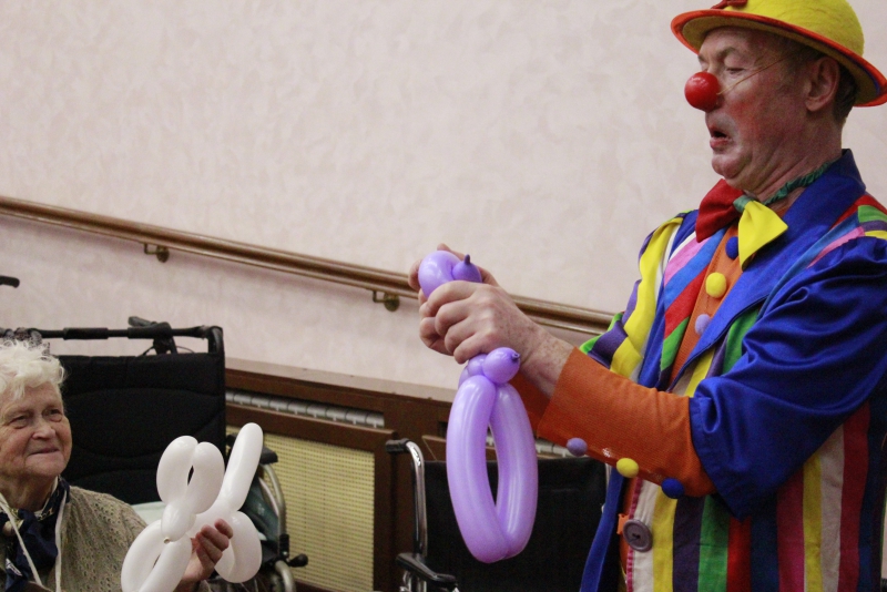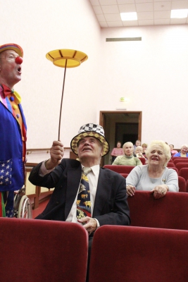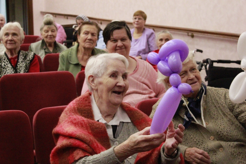 Хорошее настроение, в хмурый осенний день, подарил ветеранам клоун Фантик: всевозможные конкурсы под веселую музыку, симпатичные зверюшки, цветочки и другие предметы из шариков, появляющиеся на глазах глазах изумленной публики, доставили неподдельную радость нашим ветеранам. А на прощание все зрители получили по маленькому сувениру в подарок.