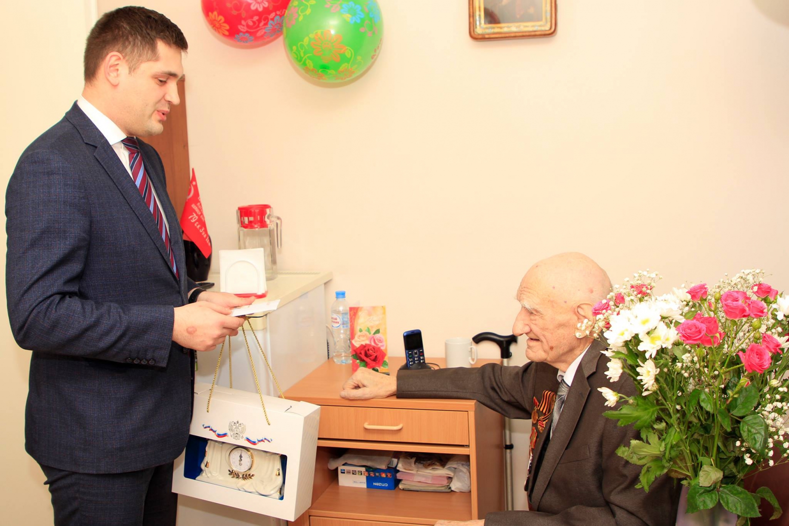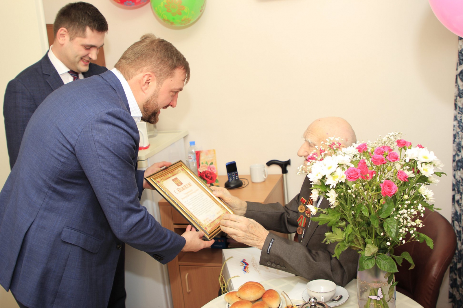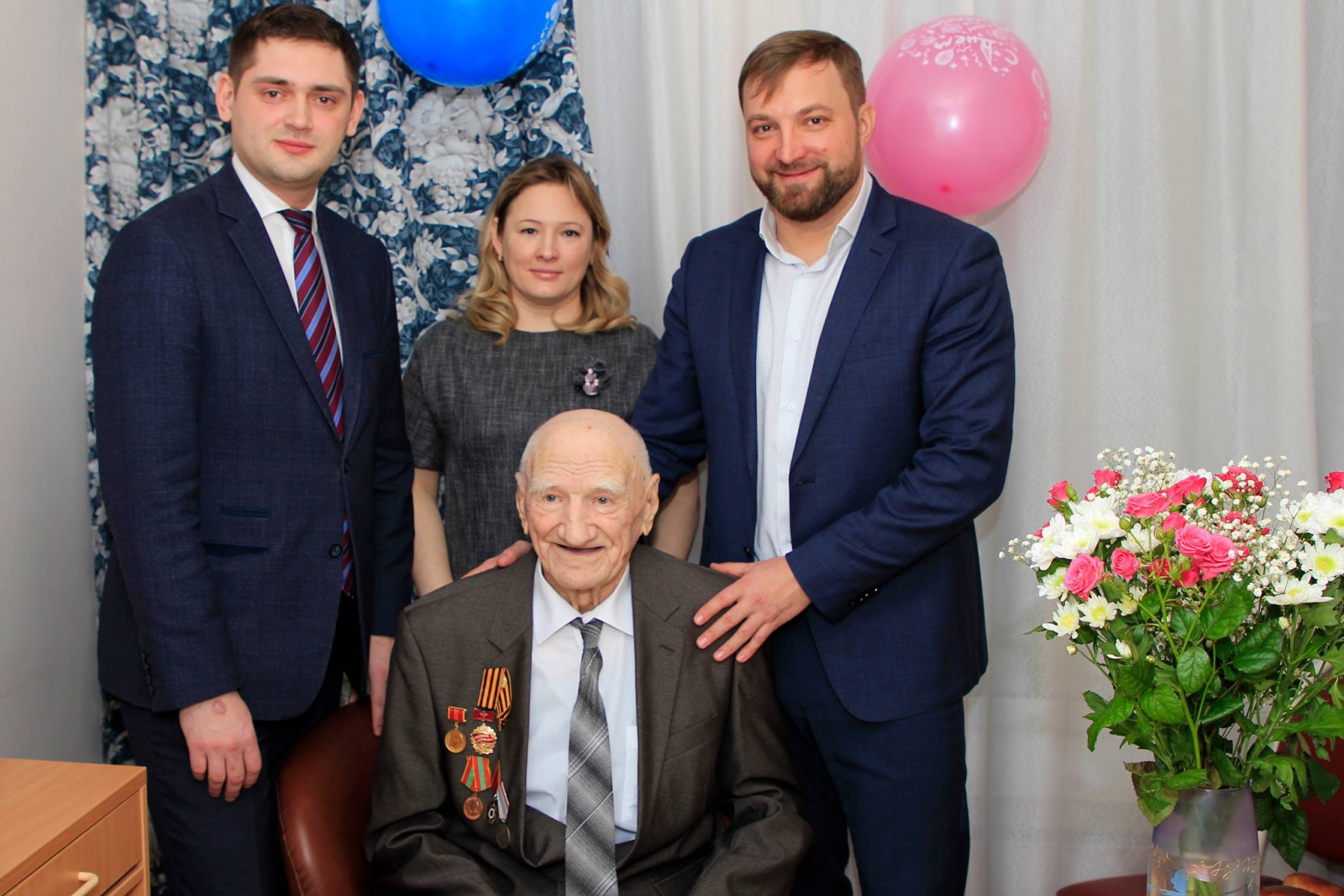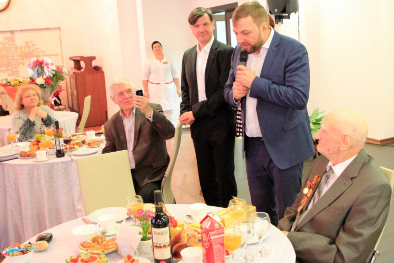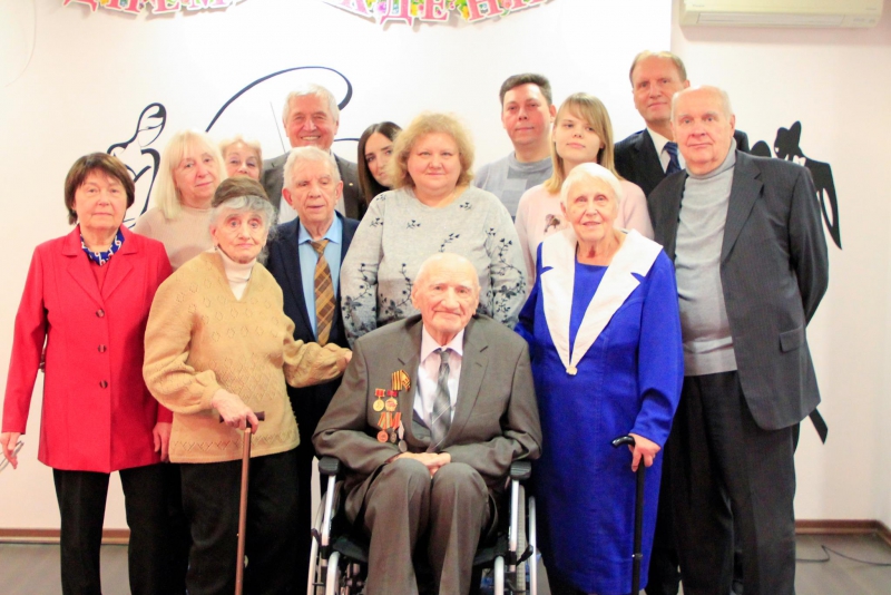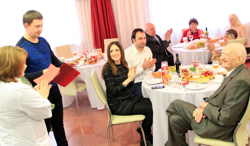В нашей большой семье - ЮБИЛЯР! Николаю Александровичу Казакову исполнилось 100 лет! За минувший век Николай Александрович стал участником многих исторических событий и всегда оставался жизнерадостным, философски относящимся к жизни человеком. С ним приятно поговорить, а особенно послушать. Много теплых поздравлений прозвучало в честь юбиляра от интересных людей, официальных лиц, сотрудников пансионата во главе с директором. И конечно, с юбилеем пришли поздравить родные и близкие Николая Александровича.
