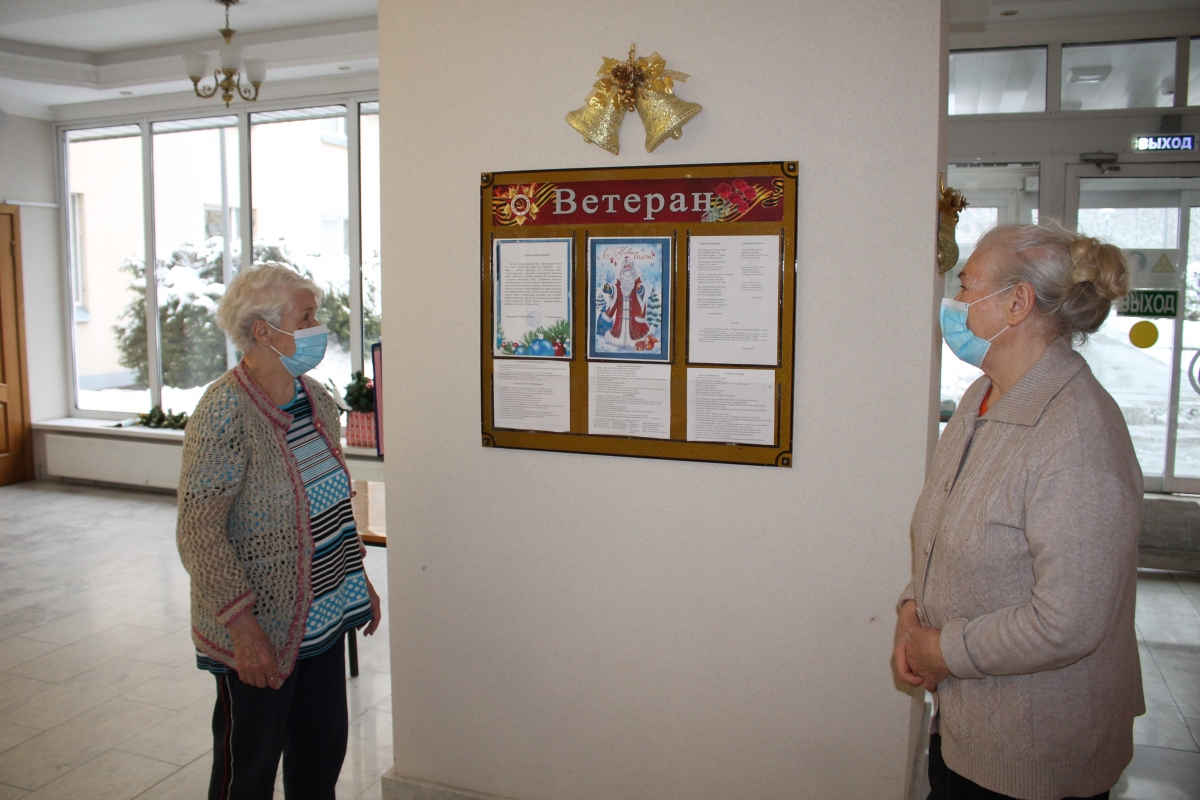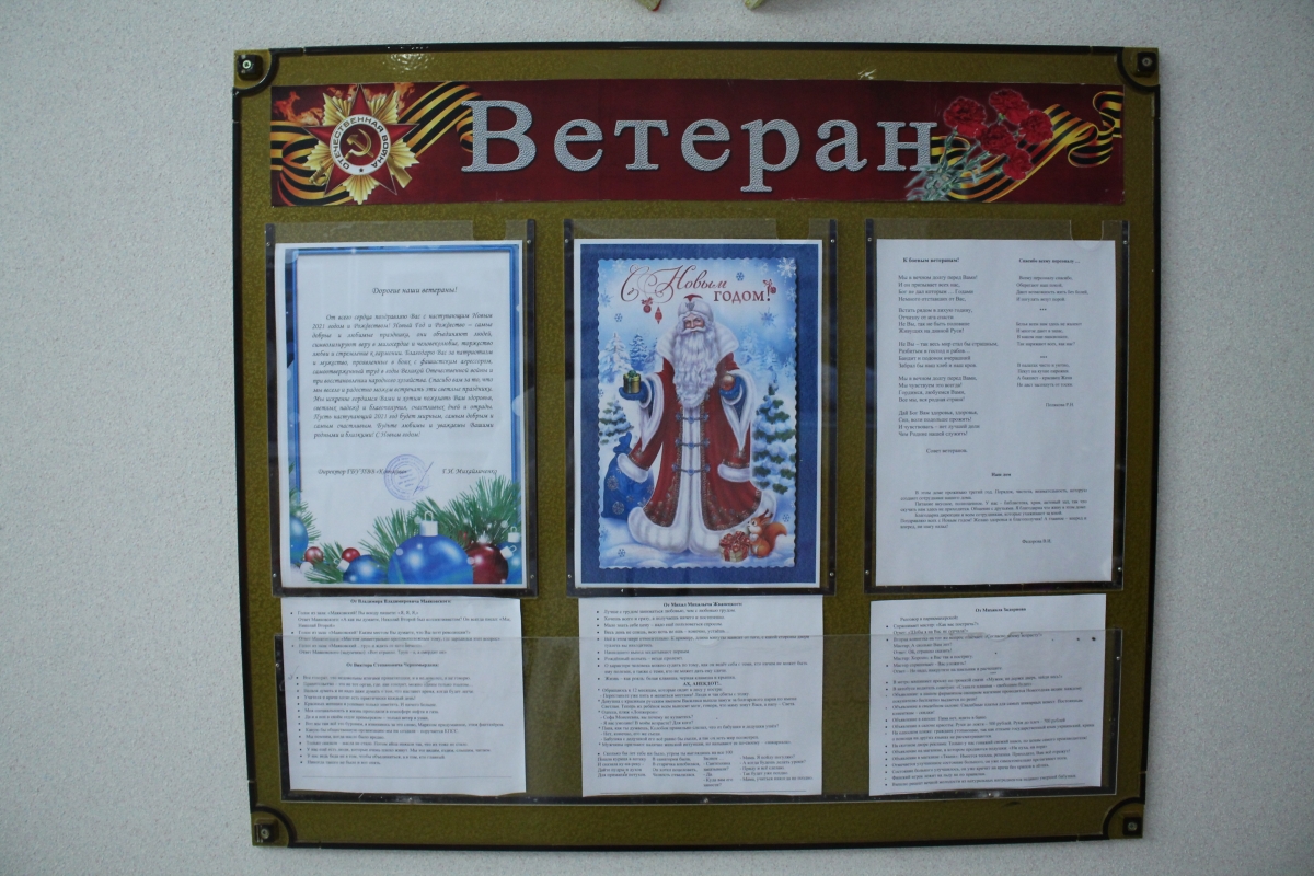 В новогодние праздники сотрудники и ветераны Пансионата приукрасили стенд «Ветеран». Новогоднее оформление, поздравление от директора Пансионата – Галины Ивановны Михайличенко, прекрасные строки - стихи от председателя Совета ветеранов - Дмитрия Борисовича Романова и Поляковой Риммы Николаевны, отзыв от Федоровой Валентины Ивановны, анекдоты, выдержки из выступлений от В.С. Черномырдина, М.М. Жванецкого и М. Задорного – радуют глаз всего коллектива ветеранов и сотрудников вахты.