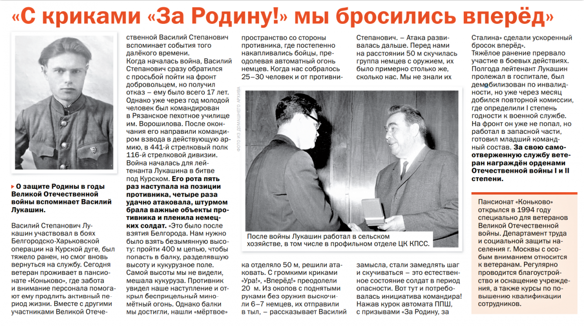 Руководство и Совет ветеранов Пансионата для ветеранов войны «Коньково» выражает огромную благодарность коллективу редакции газеты «Москва За калужской заставой» в лице главного редактора Дарьи Буравчиковой за публикацию статьи про участника Великой Отечественной войны – Лукашина Василия Степановича! Мы рассчитываем на дальнейшее сотрудничество и искренне желаем сотрудникам редакции успехов в их творческой работе, карьерного роста и семейного благополучия!