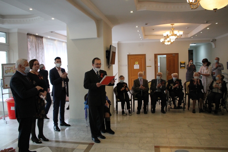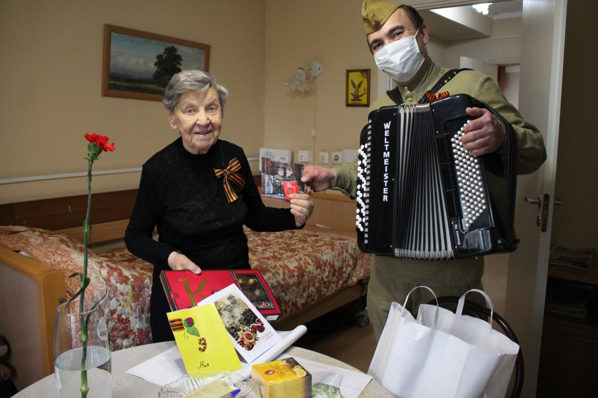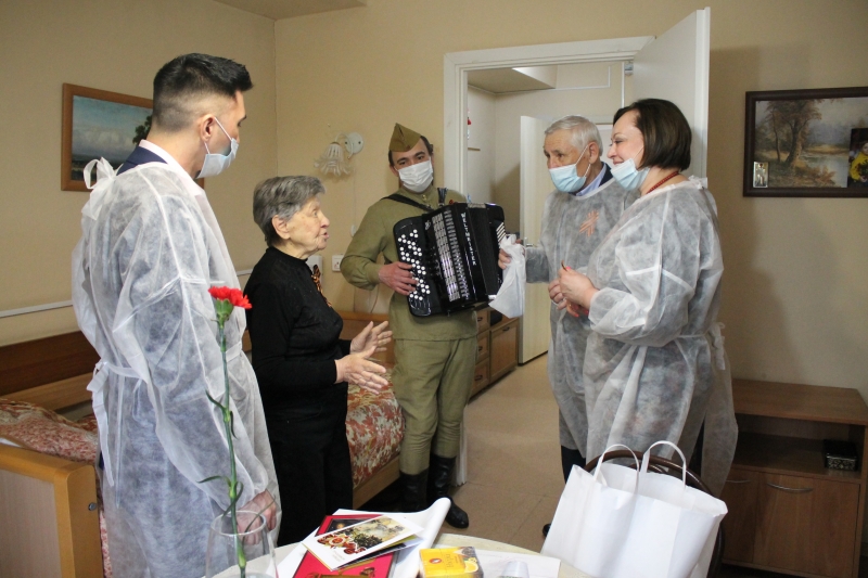 С самого утра в холле 1-го этажа звучали песни времен Великой Отечественной войны, сотрудники провожали проживающих в актовый зал на просмотр военного парада на большом экране.