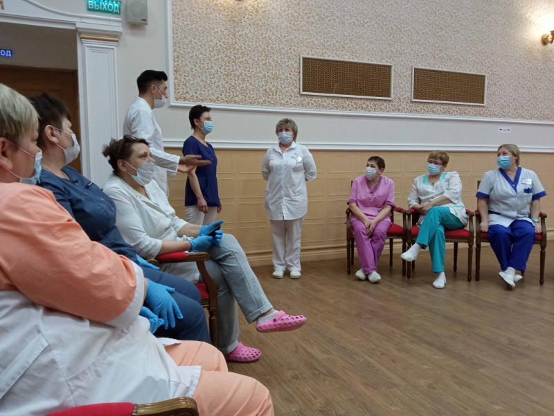 Сегодня у медиков пансионата «Коньково» опять была учеба. Они практиковались на еженедельных занятиях по коммуникативным навыкам и специфике общения с получателями услуг.