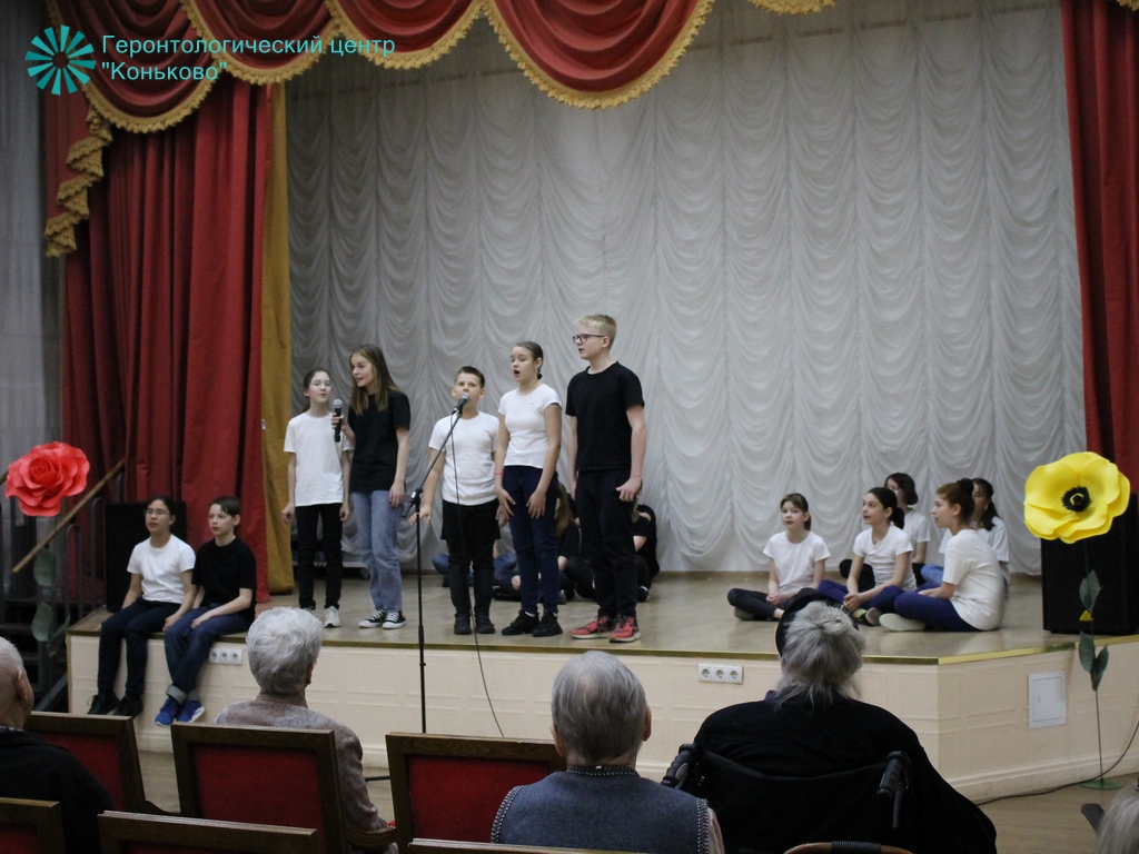 И именно в эти дни, когда мы вспоминаем о великой войне, подвигах солдат на фронте и тружеников тыла, учащиеся школы №1543 пришли в гости в наш Центр. К встрече с ветеранами ребята подготовили литературно - музыкальную композицию «Про войну. Про мир. Про счастье». Под мелодию песни «О той весне» люди, отстоявшие во время войны свободу и независимость нашей Родины, занимали свои места. И из уст ребят зазвучали слова благодарности за мирное небо, счастливое детство. Стихи о войне, о великой Победе, о памяти живым и мёртвым, прочитанные ребятами, напомнили присутствующим о годах страшной войны. А песня о мире – «Солнечный круг», исполненная совместно ребятами и присутствующими в зале ветеранами, навеяла воспоминания о далеком детстве. На глазах ветеранов выступили слезы радости и умиления за этих детей, которые живут в мирное время.